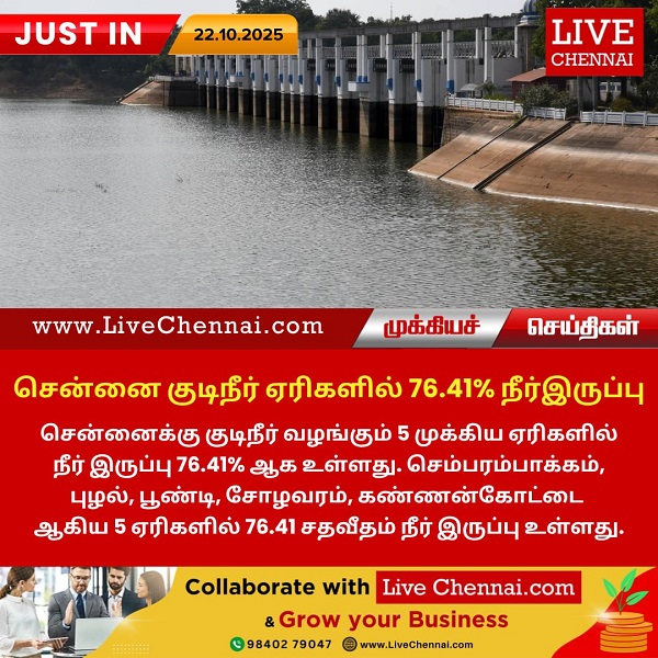 சென்னைக்கு குடிநீர் வழங்கும் 5 முக்கிய ஏரிகளில் நீர் இருப்பு 76.41% ஆக உள்ளது. செம்பரம்பாக்கம், புழல், பூண்டி, சோழவரம், கண்ணன்கோட்டை ஆகிய 5 ஏரிகளில் 76.41 சதவீதம் நீர் இருப்பு உள்ளது.