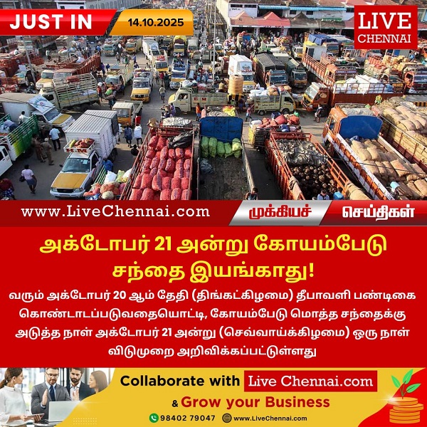 வரும் அக்டோபர் 20 ஆம் தேதி (திங்கட்கிழமை) தீபாவளி பண்டிகை கொண்டாடப்படுவதையொட்டி, கோயம்பேடு மொத்த சந்தைக்கு அடுத்த நாள் அக்டோபர் 21 அன்று (செவ்வாய்க்கிழமை) ஒரு நாள் விடுமுறை அறிவிக்கப்பட்டுள்ளது.