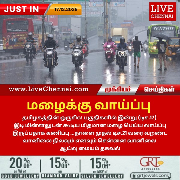 தமிழகத்தின் ஒருசில பகுதிகளில் இன்று (டிச.17) இடி மின்னலுடன் கூடிய மிதமான மழை பெய்ய வாய்ப்பு இருப்பதாகவும் நாளை முதல் டிச.21 வரை வறண்ட வானிலை நிலவும் எனவும் சென்னை வானிலை ஆய்வு மையம் தெரிவிப்பு.