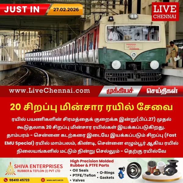 ரயில் பயணிகளின் சிரமத்தைக் குறைக்க இன்று(பிப்.27) முதல் கூடுதலாக 20 சிறப்பு மின்சார ரயில்கள் இயக்கப்படுகிறது. தாம்பரம் – சென்னை கடற்கரை இடையே இயக்கப்படும் சிறப்பு (Fast EMU Special)...