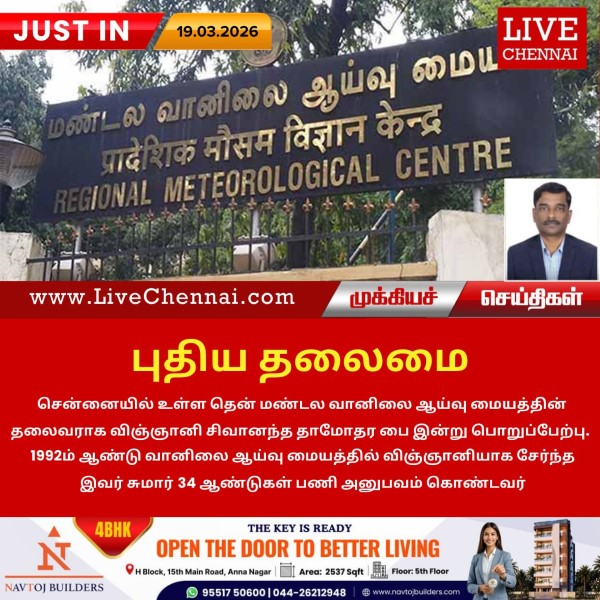 சென்னையில் உள்ள தென் மண்டல வானிலை ஆய்வு மையத்தின் தலைவராக விஞ்ஞானி சிவானந்த தாமோதர பை இன்று பொறுப்பேற்பு. 1992ம் ஆண்டு வானிலை ஆய்வு மையத்தில் விஞ்ஞானியாக சேர்ந்த இவர்...