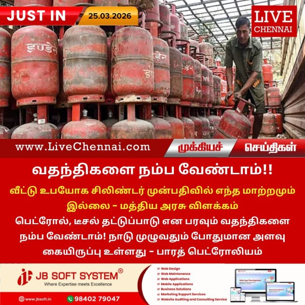 வீட்டு உபயோக சிலிண்டர் முன்பதிவில் எந்த மாற்றமும் இல்லை – மத்திய அரசு விளக்கம் பெட்ரோல், டீசல் தட்டுப்பாடு என பரவும் வதந்திகளை நம்ப வேண்டாம்! நாடு முழுவதும் போதுமான...