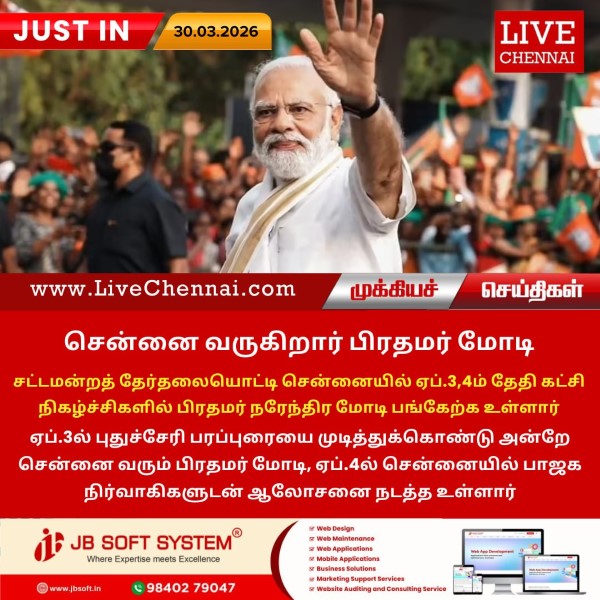 சட்டமன்றத் தேர்தலையொட்டி சென்னையில் ஏப்.3,4ம் தேதி கட்சி நிகழ்ச்சிகளில் பிரதமர் நரேந்திர மோடி பங்கேற்க உள்ளார். ஏப்.3ல் புதுச்சேரி பரப்புரையை முடித்துக்கொண்டு அன்றே சென்னை வரும் பிரதமர் மோடி, ஏப்.4ல்...