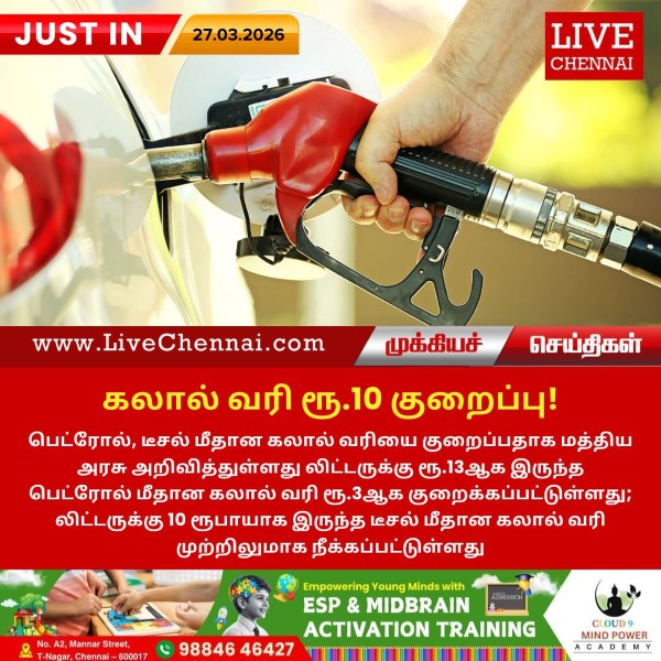 பெட்ரோல், டீசல் மீதான கலால் வரியை குறைப்பதாக மத்திய அரசு அறிவித்துள்ளது லிட்டருக்கு ரூ.13ஆக இருந்த பெட்ரோல் மீதான கலால் வரி ரூ.3ஆக குறைக்கப்பட்டுள்ளது; லிட்டருக்கு 10 ரூபாயாக இருந்த...