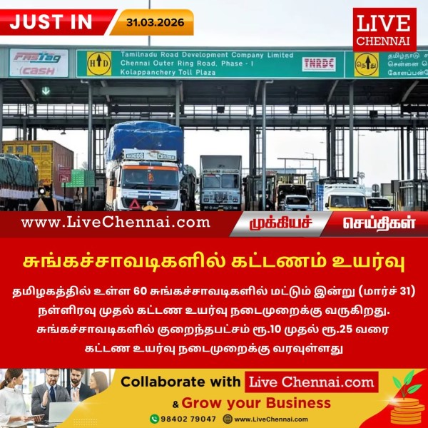 தமிழகத்தில் உள்ள 60 சுங்கச்சாவடிகளில் மட்டும் இன்று (மார்ச் 31) நள்ளிரவு முதல் கட்டண உயர்வு நடைமுறைக்கு வருகிறது. சுங்கச்சாவடிகளில் குறைந்தபட்சம் ரூ.10 முதல் ரூ.25 வரை கட்டண உயர்வு...