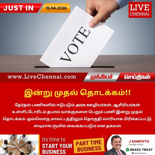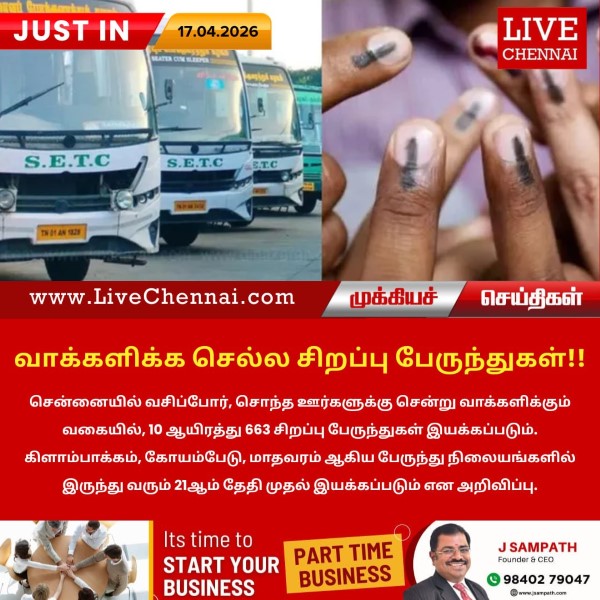 சென்னையில் வசிப்போர், சொந்த ஊர்களுக்கு சென்று வாக்களிக்கும் வகையில், 10 ஆயிரத்து 663 சிறப்பு பேருந்துகள் இயக்கப்படும். கிளாம்பாக்கம், கோயம்பேடு, மாதவரம் ஆகிய பேருந்து நிலையங்களில் இருந்து வரும் 21ஆம்...