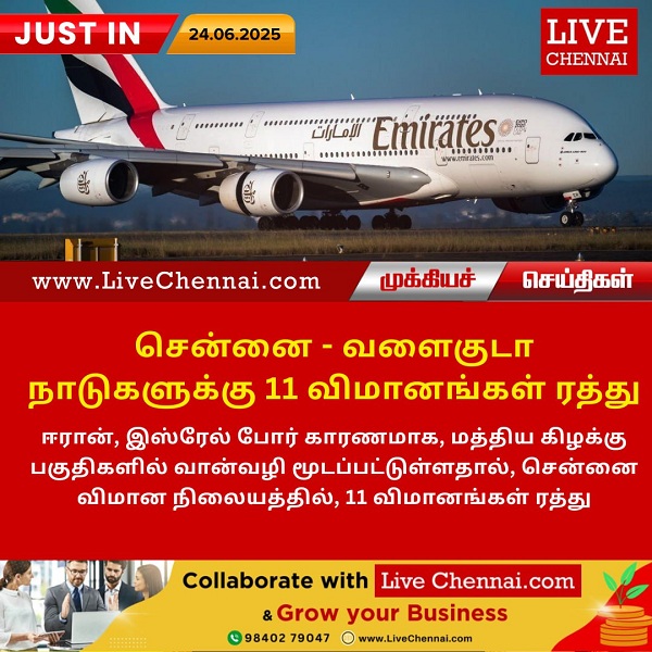 ஈரான், இஸ்ரேல் போர் காரணமாக, மத்திய கிழக்கு பகுதிகளில் வான்வழி மூடப்பட்டுள்ளதால், சென்னை விமான நிலையத்தில், 11 விமானங்கள் ரத்து.