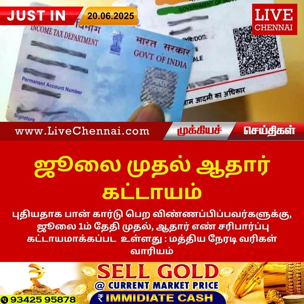 புதியதாக பான் கார்டு பெற விண்ணப்பிப்பவர்களுக்கு, ஜூலை 1ம் தேதி முதல், ஆதார் எண் சரிபார்ப்பு கட்டாயமாக்கப்பட உள்ளது : மத்திய நேரடி வரிகள் வாரியம்.