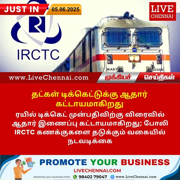 Posted on : June 5, 2025 ரயில் டிக்கெட் முன்பதிவிற்கு விரைவில் ஆதார் இணைப்பு கட்டாயமாகிறது; போலி IRCTC கணக்குகளை தடுக்கும் வகையில் நடவடிக்கை.