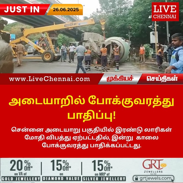 Posted on : June 26, 2025 சென்னை அடையாறு பகுதியில் இரண்டு லாரிகள் மோதி விபத்து ஏற்பட்டதில், இன்று காலை போக்குவரத்து பாதிக்கப்பட்டது.