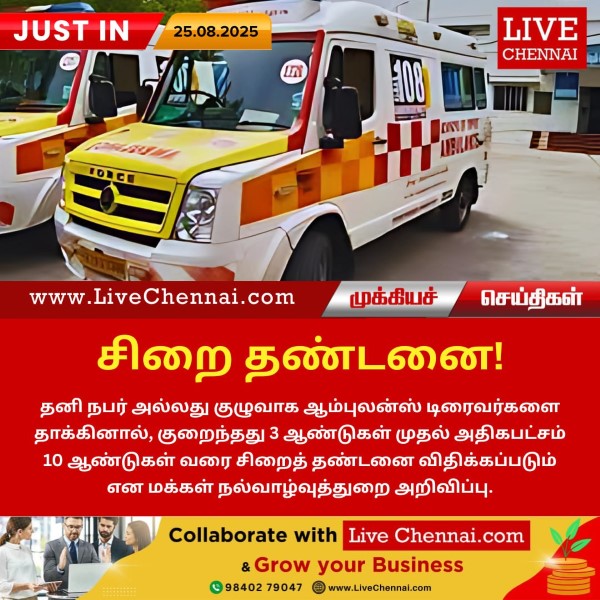 தனி நபர் அல்லது குழுவாக ஆம்புலன்ஸ் டிரைவர்களை தாக்கினால், குறைந்தது 3 ஆண்டுகள் முதல் அதிகபட்சம் 10 ஆண்டுகள் வரை சிறைத் தண்டனை விதிக்கப்படும் என மக்கள் நல்வாழ்வுத்துறை அறிவிப்பு.