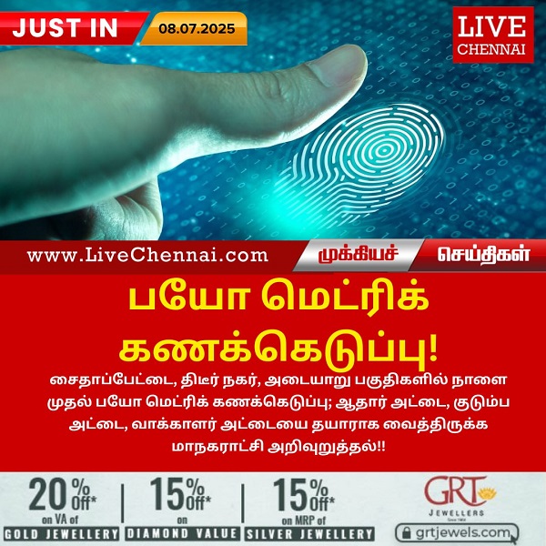சைதாப்பேட்டை, திடீர் நகர், அடையாறு பகுதிகளில் நாளை முதல் பயோ மெட்ரிக் கணக்கெடுப்பு; ஆதார் அட்டை, குடும்ப அட்டை, வாக்காளர் அட்டையை தயாராக வைத்திருக்க மாநகராட்சி அறிவுறுத்தல்!!