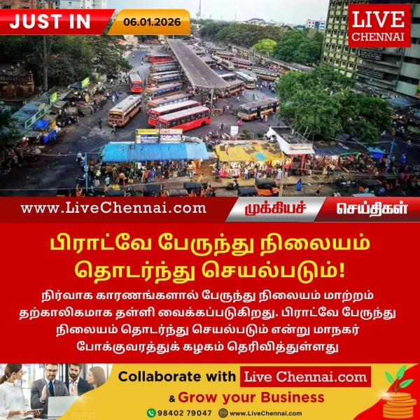நிர்வாக காரணங்களால் பேருந்து நிலையம் மாற்றம் தற்காலிகமாக தள்ளி வைக்கப்படுகிறது. பிராட்வே பேருந்து நிலையம் தொடர்ந்து செயல்படும் என்று மாநகர் போக்குவரத்துக் கழகம் தெரிவித்துள்ளது.