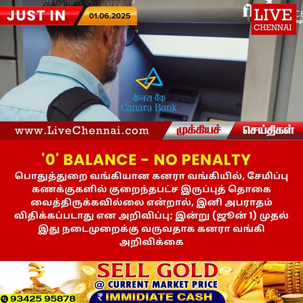 பொதுத்துறை வங்கியான கனரா வங்கியில், சேமிப்பு கணக்குகளில் குறைந்தபட்ச இருப்புத் தொகை வைத்திருக்கவில்லை என்றால், இனி அபராதம் விதிக்கப்படாது என அறிவிப்பு; இன்று (ஜூன் 1) முதல் இது நடைமுறைக்கு வருவதாக கனரா வங்கி அறிவிக்கை.