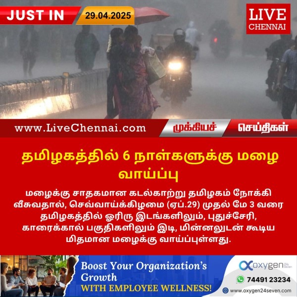 மழைக்கு சாதகமான கடல்காற்று தமிழகம் நோக்கி வீசுவதால், செவ்வாய்க்கிழமை (ஏப்.29) முதல் மே 3 வரை தமிழகத்தில் ஓரிரு இடங்களிலும், புதுச்சேரி, காரைக்கால் பகுதிகளிலும் இடி, மின்னலுடன் கூடிய மிதமான...