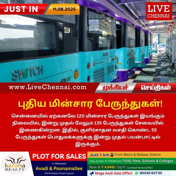 சென்னையில் ஏற்கனவே 120 மின்சார பேருந்துகள் இயங்கும் நிலையில், இன்று முதல் மேலும் 135 பேருந்துகள் சேவையில் இணைகின்றன. இதில், குளிர்சாதன வசதி கொண்ட 55 பேருந்துகள் பொதுமக்களுக்கு இன்று முதல் பயன்பாட்டில் இருக்கும்.
