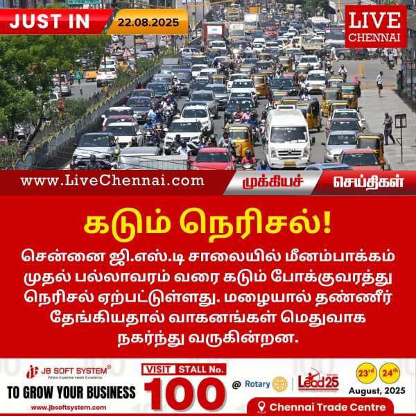 சென்னை ஜி.எஸ்.டி சாலையில் மீனம்பாக்கம் முதல் பல்லாவரம் வரை கடும் போக்குவரத்து நெரிசல் ஏற்பட்டுள்ளது. மழையால் தண்ணீர் தேங்கியதால் வாகனங்கள் மெதுவாக நகர்ந்து வருகின்றன.