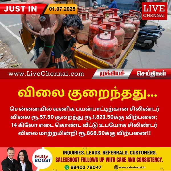 சென்னையில் வணிக பயன்பாட்டிற்கான சிலிண்டர் விலை ரூ.57.50 குறைந்து ரூ.1,823.50க்கு விற்பனை; 14 கிலோ எடை கொண்ட வீட்டு உபயோக சிலிண்டர் விலை மாற்றமின்றி ரூ.868.50க்கு விற்பனை!!
