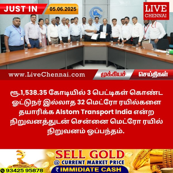 ரூ.1,538.35 கோடியில் 3 பெட்டிகள் கொண்ட ஓட்டுநர் இல்லாத 32 மெட்ரோ ரயில்களை தயாரிக்க Alstom Transport India என்ற நிறுவனத்துடன் சென்னை மெட்ரோ ரயில் நிறுவனம் ஒப்பந்தம்.