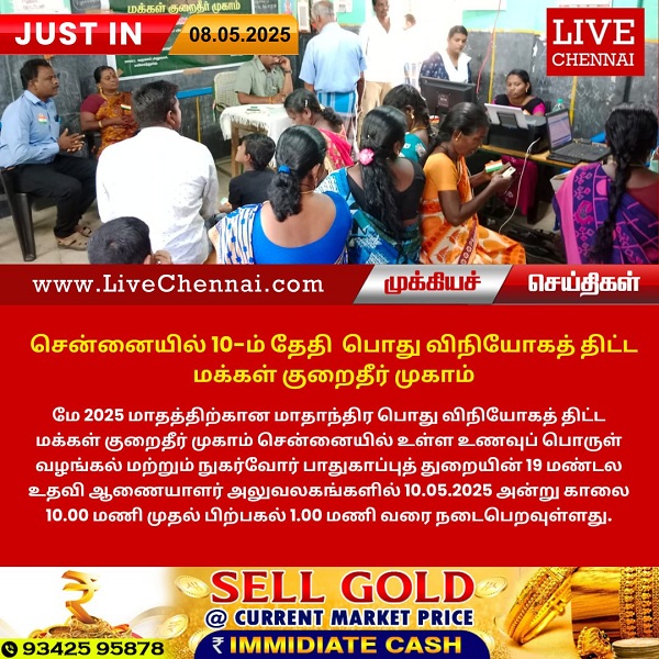 மே 2025 மாதத்திற்கான மாதாந்திர பொது விநியோகத் திட்ட மக்கள் குறைதீர் முகாம் சென்னையில் உள்ள உணவுப் பொருள் வழங்கல் மற்றும் நுகர்வோர் பாதுகாப்புத் துறையின் 19 மண்டல உதவி ஆணையாளர் அலுவலகங்களில் 10.05.2025 அன்று காலை 10.00 மணி முதல் பிற்பகல் 1.00 மணி வரை நடைபெறவுள்ளது.