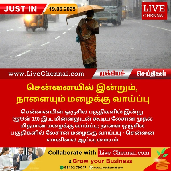 சென்னையின் ஒருசில பகுதிகளில் இன்று (ஜூன் 19) இடி, மின்னலுடன் கூடிய லேசான முதல் மிதமான மழைக்கு வாய்ப்பு; நாளை ஒருசில பகுதிகளில் லேசான மழைக்கு வாய்ப்பு – சென்னை வானிலை ஆய்வு மையம்.