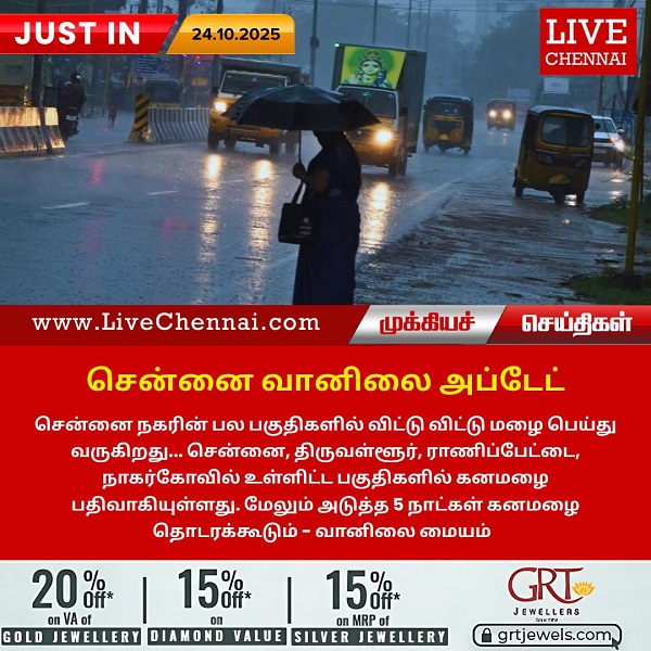 சென்னை நகரின் பல பகுதிகளில் விட்டு விட்டு மழை பெய்து வருகிறது.சென்னை, திருவள்ளூர், ராணிப்பேட்டை, நாகர்கோவில் உள்ளிட்ட பகுதிகளில் கனமழை பதிவாகியுள்ளது. மேலும் அடுத்த 5 நாட்கள் கனமழை தொடரக்கூடும் – வானிலை மையம் தகவல்