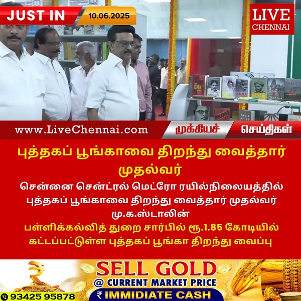 சென்னை சென்ட்ரல் மெட்ரோ ரயில்நிலையத்தில் புத்தகப் பூங்காவை திறந்து வைத்தார் முதல்வர் மு.க.ஸ்டாலின். பள்ளிக்கல்வித் துறை சார்பில் ரூ.1.85 கோடியில் கட்டப்பட்டுள்ள புத்தகப் பூங்கா திறந்து வைப்பு.