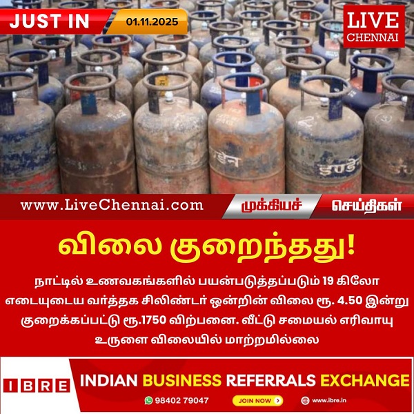 நாட்டில் உணவகங்களில் பயன்படுத்தப்படும் 19 கிலோ எடையுடைய வர்த்தக சிலிண்டர் ஒன்றின் விலை ரூ. 4.50 இன்று குறைக்கப்பட்டு ரூ.1750 விற்பனை. வீட்டு சமையல் எரிவாயு உருளை விலையில் மாற்றமில்லை.
