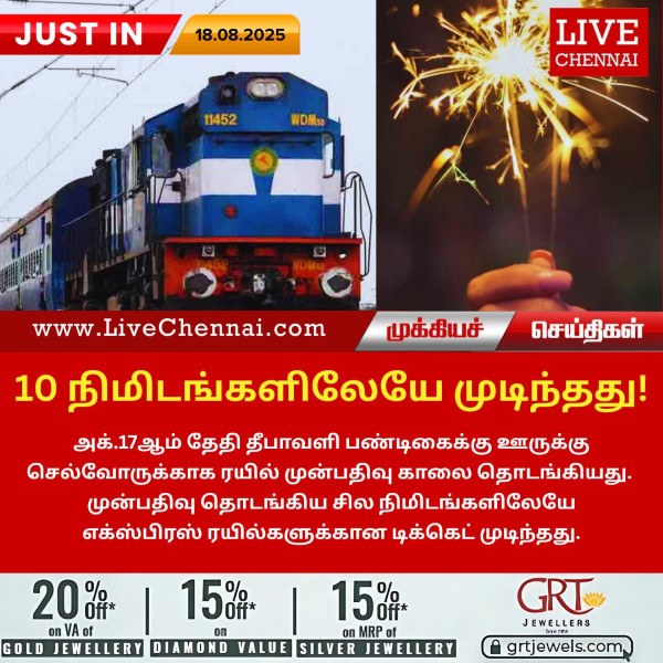 அக்.17ஆம் தேதி தீபாவளி பண்டிகைக்கு ஊருக்கு செல்வோருக்காக ரயில் முன்பதிவு காலை தொடங்கியது. முன்பதிவு தொடங்கிய சில நிமிடங்களிலேயே எக்ஸ்பிரஸ் ரயில்களுக்கான டிக்கெட் முடிந்தது.