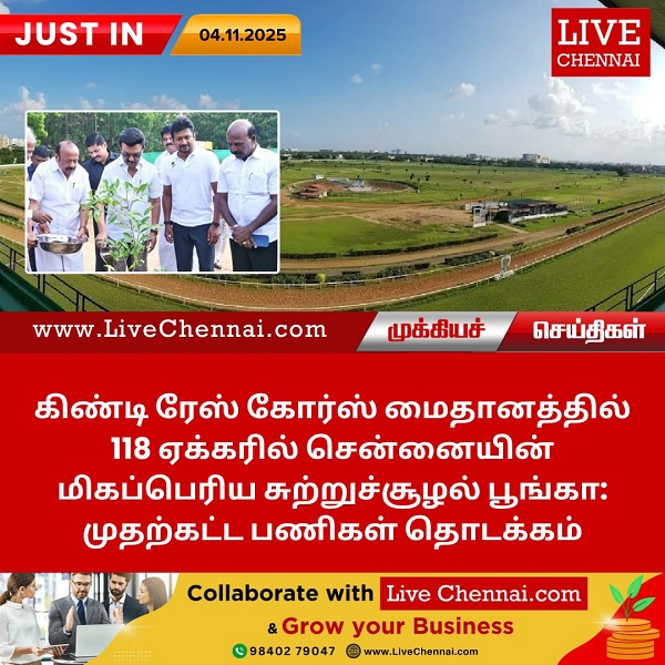 Posted on : November 4, 2025 கிண்டி ரேஸ் கோர்ஸ் மைதானத்தில் 118 ஏக்கரில் சென்னையின் மிகப்பெரிய சுற்றுச்சூழல் பூங்கா: முதற்கட்ட பணிகள் தொடக்கம்.