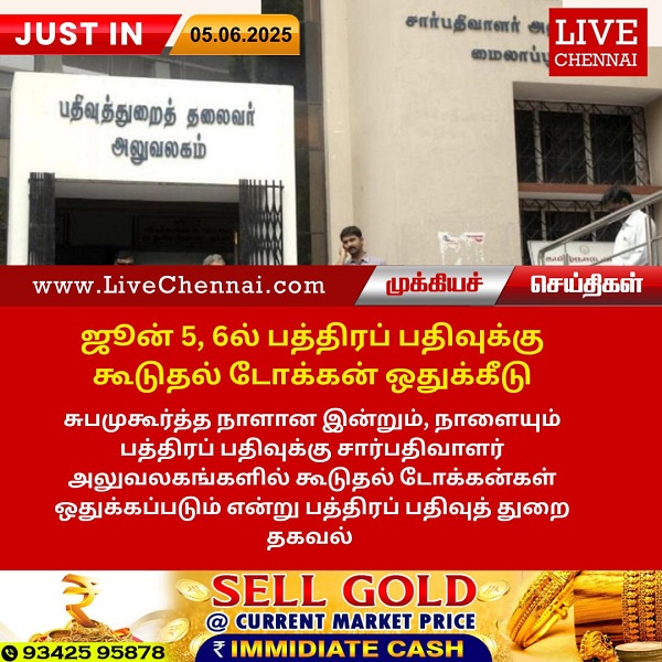 சுபமுகூர்த்த நாளான இன்றும், நாளையும் பத்திரப் பதிவுக்கு சார்பதிவாளர் அலுவலகங்களில் கூடுதல் டோக்கன்கள் ஒதுக்கப்படும் என்று பத்திரப் பதிவுத் துறை தகவல்