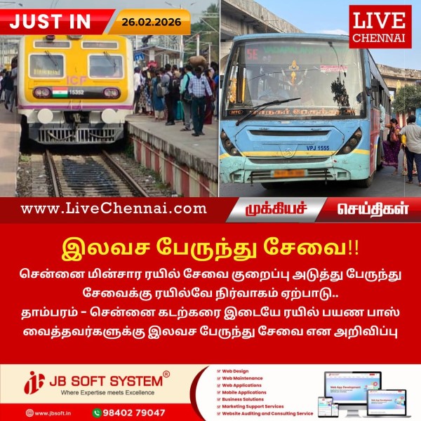 சென்னை மின்சார ரயில் சேவை குறைப்பு அடுத்து பேருந்து சேவைக்கு ரயில்வே நிர்வாகம் ஏற்பாடு.தாம்பரம் – சென்னை கடற்கரை இடையே ரயில் பயண பாஸ் வைத்தவர்களுக்கு இலவச பேருந்து சேவை என அறிவிப்பு.