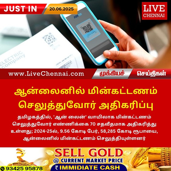 தமிழகத்தில், ‘ஆன் லைன்’ வாயிலாக மின்கட்டணம் செலுத்துவோர் எண்ணிக்கை 70 சதவீதமாக அதிகரித்து உள்ளது; 2024-25ல், 9.56 கோடி பேர், 58,285 கோடி ரூபாயை, ஆன்லைனில் மின்கட்டணம் செலுத்தியுள்ளனர்.