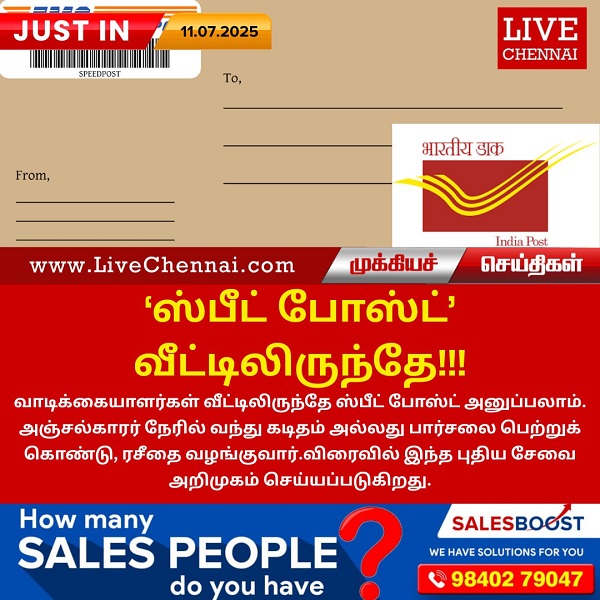 வாடிக்கையாளர்கள் வீட்டிலிருந்தே ஸ்பீட் போஸ்ட் அனுப்பலாம். அஞ்சல்காரர் நேரில் வந்து கடிதம் அல்லது பார்சலை பெற்றுக் கொண்டு, ரசீதை வழங்குவார்.விரைவில் இந்த புதிய சேவை அறிமுகம் செய்யப்படுகிறது.