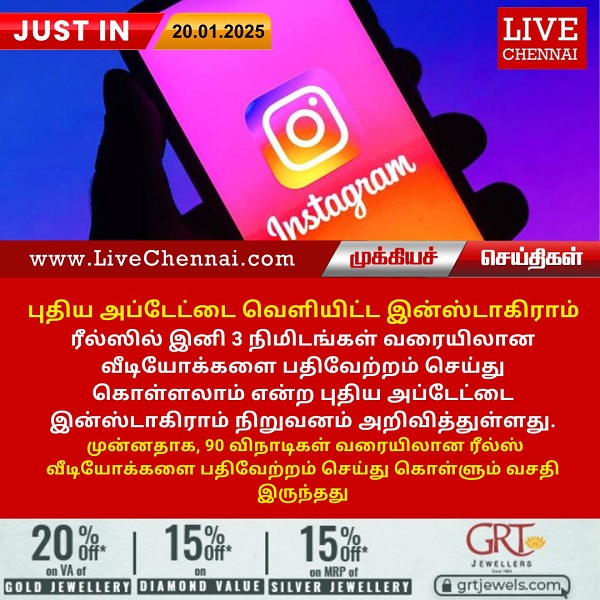 ரீல்ஸில் இனி 3 நிமிடங்கள் வரையிலான வீடியோக்களை பதிவேற்றம் செய்து கொள்ளலாம் என்ற புதிய அப்டேட்டை இன்ஸ்டாகிராம் நிறுவனம் அறிவித்துள்ளது. முன்னதாக, 90 விநாடிகள் வரையிலான ரீல்ஸ் வீடியோக்களை பதிவேற்றம் செய்து கொள்ளும் வசதி இருந்தது