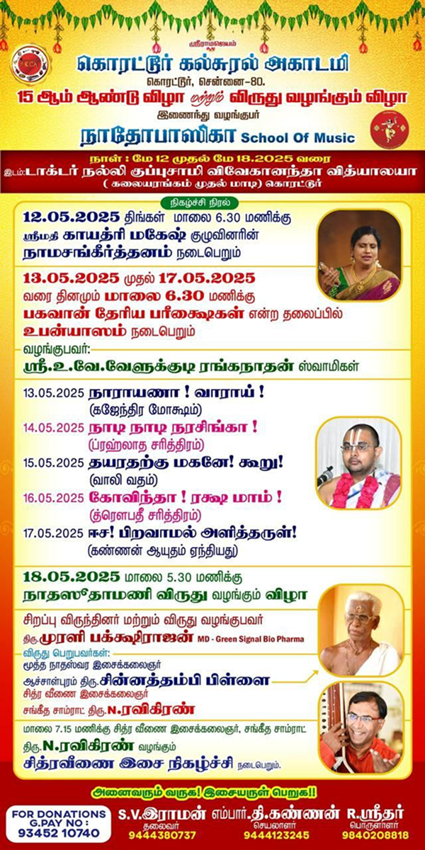 கொரட்டூர் கல்ச்சுரல் அகாடமியின் 15வது ஆண்டு விழா, நாதோபாஸிகா School of Music உடன் இணைந்து 2025 மே 12 முதல் 18 வரை சிறப்பாக நடத்தப்படுகிறது.