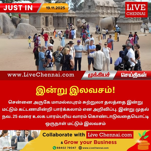 சென்னை அருகே மாமல்லபுரம் சுற்றுலா தலத்தை இன்று மட்டும் கட்டணமின்றி பார்க்கலாம் என அறிவிப்பு. இன்று முதல் நவ. 25 வரை உலக பாரம்பரிய வாரம் கொண்டாடுவதையொட்டி ஒருநாள் மட்டும் இலவசம்.