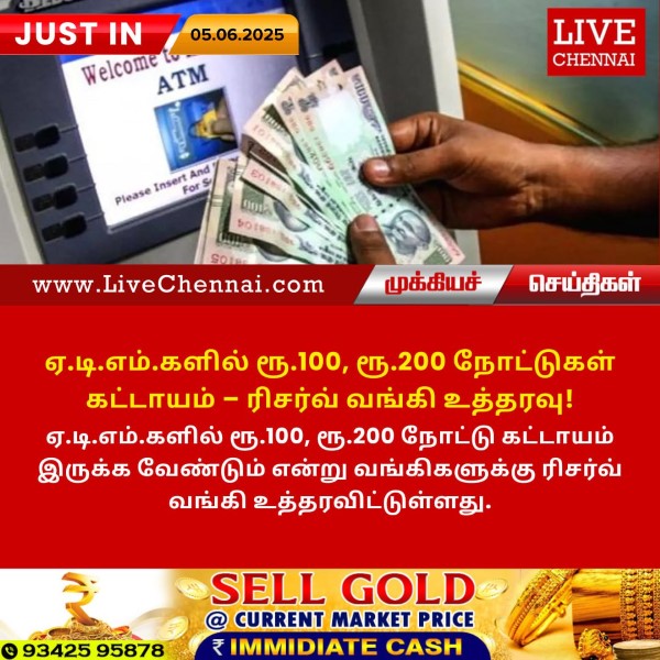 Posted on : June 5, 2025 ஏ.டி.எம்.களில் ரூ.100, ரூ.200 நோட்டு கட்டாயம் இருக்க வேண்டும் என்று வங்கிகளுக்கு ரிசர்வ் வங்கி உத்தரவிட்டுள்ளது.