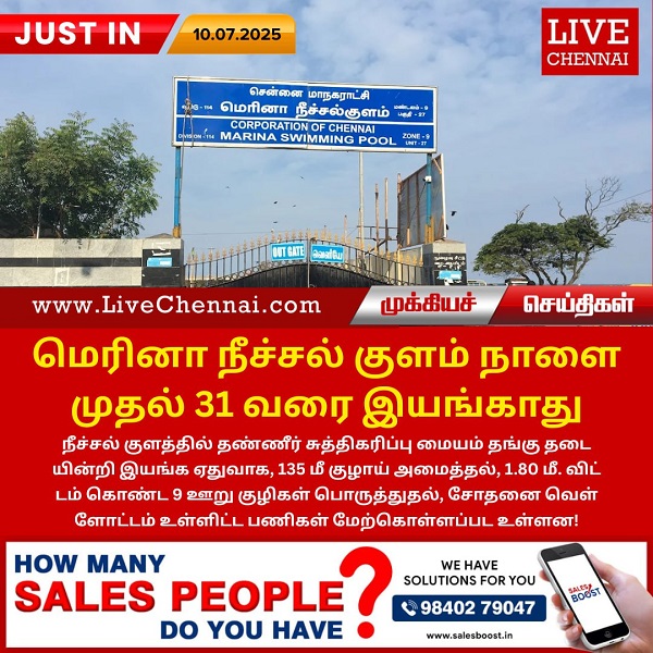 நீச்சல் குளத்தில் தண்ணீர் சுத்திகரிப்பு மையம் தங்கு தடை யின்றி இயங்க ஏதுவாக, 135 மீ குழாய் அமைத்தல், 1.80 மீ. விட் டம் கொண்ட 9 ஊறு குழிகள் பொருத்துதல், சோதனை வெள் ளோட்டம் உள்ளிட்ட பணிகள் மேற்கொள்ளப்பட உள்ளன!