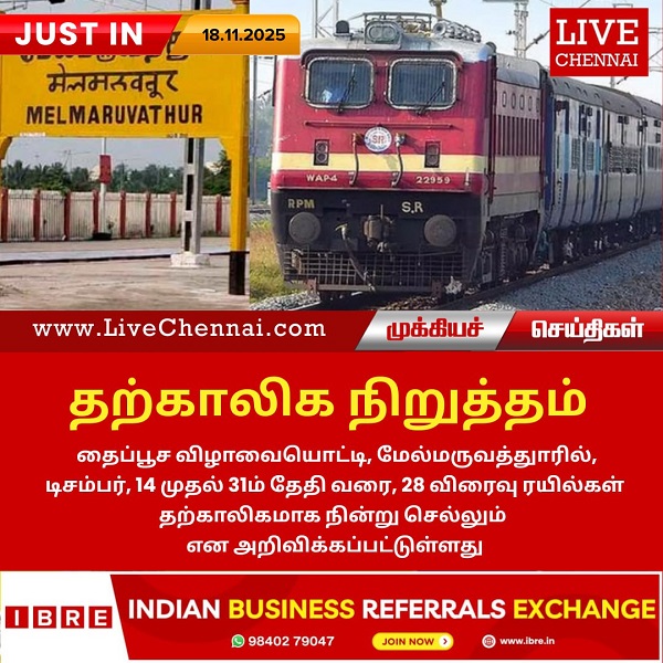 தைப்பூச விழாவையொட்டி, மேல்மருவத்துாரில், டிசம்பர், 14 முதல் 31ம் தேதி வரை, 28 விரைவு ரயில்கள் தற்காலிகமாக நின்று செல்லும் என அறிவிக்கப்பட்டுள்ளது.