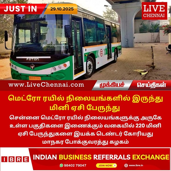 சென்னை மெட்ரோ ரயில் நிலையங்களுக்கு அருகே உள்ள பகுதிகளை இணைக்கும் வகையில் 220 மினி ஏசி பேருந்துகளை இயக்க டெண்டர் கோரியது மாநகர போக்குவரத்து கழகம்.