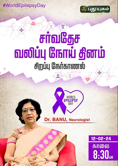 புதுயுகம் தொலைக்காட்சியில் ஒளிபரப்பாகும் சிறப்பு நேர்காணல் வரும் பிப்ரவரி திங்கட்கிழமை 12.02.2024 காலை 8.30 மணிக்கு சர்வதேச வலிப்பு நோய் தின விழிப்புணர்வு நாள் ஒளிபரப்பாக உள்ளது .