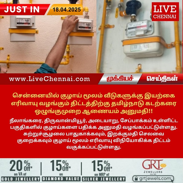 சென்னையில் குழாய் மூலம் வீடுகளுக்கு இயற்கை எரிவாயு வழங்கும் திட்டத்திற்கு தமிழ்நாடு கடற்கரை ஒழுங்குமுறை ஆணையம் அனுமதி.நீலாங்கரை, திருவான்மியூர், அடையாறு, சேப்பாக்கம் உள்ளிட்ட பகுதிகளில் குழாய்களை பதிக்க அனுமதி வழங்கப்பட்டுள்ளது. சுற்றுச்சூழலை பாதுகாக்கவும், இறக்குமதி செலவை குறைக்கவும் குழாய் மூலம் எரிவாயு விநியோகிக்க திட்டம் வகுக்கப்பட்டுள்ளது.