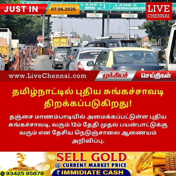 தஞ்சை மாணம்பாடியில் அமைக்கப்பட்டுள்ள புதிய சுங்கச்சாவடி, வரும் 12ம் தேதி முதல் பயன்பாட்டுக்கு வரும் என தேசிய நெடுஞ்சாலை ஆணையம்.