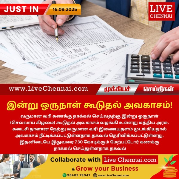 வருமான வரி கணக்கு தாக்கல் செய்வதற்கு இன்று ஒருநாள் (செவ்வாய் கிழமை) கூடுதல் அவகாசம் வழங்கி உள்ளது மத்திய அரசு. கடைசி நாளான நேற்று வருமான வரி இணையதளம் முடங்கியதால் அவகாசம் நீட்டிக்கப்பட்டுள்ளதாக தகவல் தெரிவிக்கப்பட்டுள்ளது. இதனிடையே இதுவரை 7.30 கோடிக்கும் மேற்பட்டோர் கணக்கு தாக்கல் செய்துள்ளதாக தகவல்