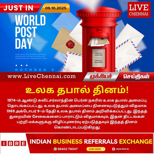 1874-ம் ஆண்டு சுவிட்சர்லாந்தின் பெர்ன் நகரில் உலக தபால் அமைப்பு தொடங்கப்பட்டது. உலக தபால் அமைப்பை நினைவுபடுத்தும் விதமாக 1969 அக்டோபர் 9-ம் தேதி உலக தபால் தினம் அறிவிக்கப்பட்டது....