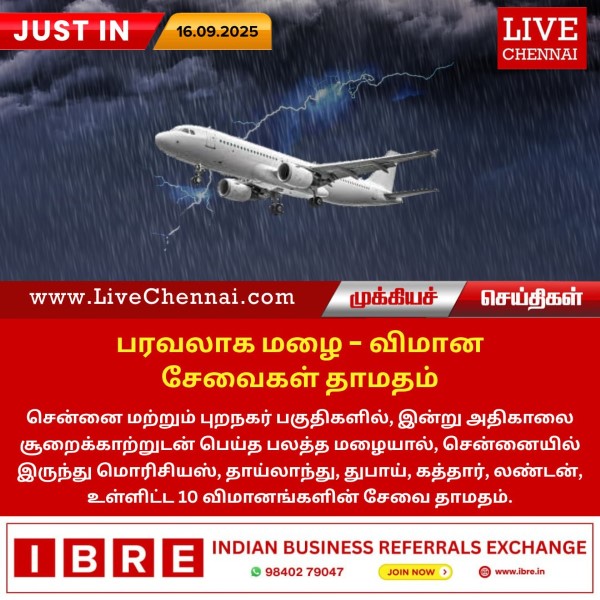 சென்னை மற்றும் புறநகர் பகுதிகளில், இன்று அதிகாலை சூறைக்காற்றுடன் பெய்த பலத்த மழையால், சென்னையில் இருந்து மொரிசியஸ், தாய்லாந்து, துபாய், கத்தார், லண்டன், உள்ளிட்ட 10 விமானங்களின் சேவை தாமதம்.