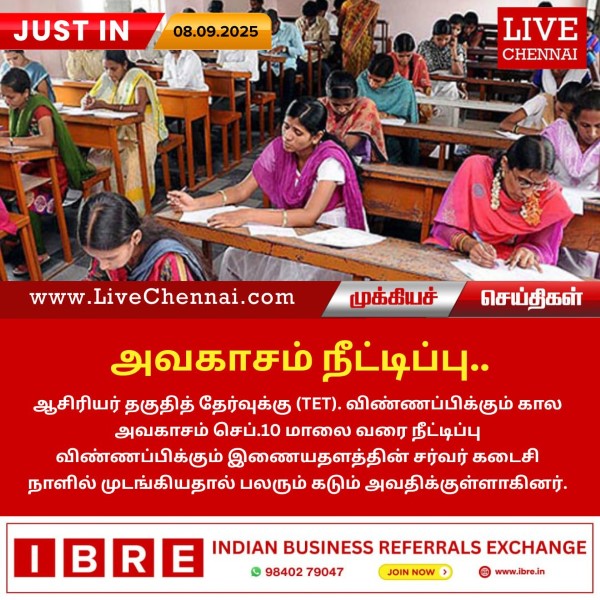 ஆசிரியர் தகுதித் தேர்வுக்கு (TET). விண்ணப்பிக்கும் கால அவகாசம் செப்.10 மாலை வரை நீட்டிப்பு விண்ணப்பிக்கும் இணையதளத்தின் சர்வர் கடைசி நாளில் முடங்கியதால் பலரும் கடும் அவதிக்குள்ளாகினர்.