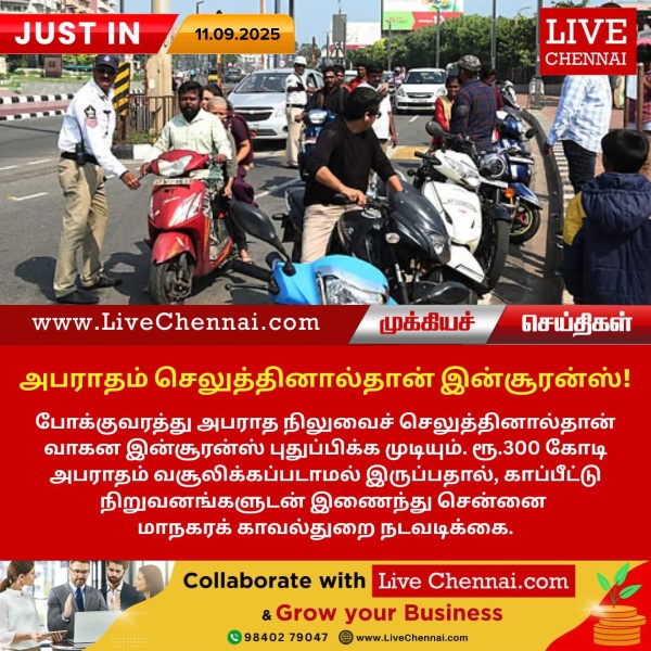 போக்குவரத்து அபராத நிலுவைச் செலுத்தினால்தான் வாகன இன்சூரன்ஸ் புதுப்பிக்க முடியும். ரூ.300 கோடி அபராதம் வசூலிக்கப்படாமல் இருப்பதால், காப்பீட்டு நிறுவனங்களுடன் இணைந்து சென்னை மாநகரக் காவல்துறை நடவடிக்கை.