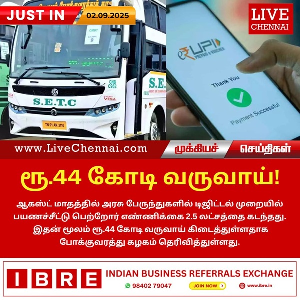 ஆகஸ்ட் மாதத்தில் அரசு பேருந்துகளில் டிஜிட்டல் முறையில் பயணச்சீட்டு பெற்றோர் எண்ணிக்கை 2.5 லட்சத்தை கடந்தது. இதன் மூலம் ரூ.44 கோடி வருவாய் கிடைத்துள்ளதாக போக்குவரத்து கழகம் தெரிவித்துள்ளது.